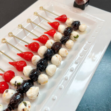 For our Game Day Party, we wanted to create an appetizer in signature red and black! We combined marinated pearl-sized mozzarella with sweet Peruvian peppers and salty olives.