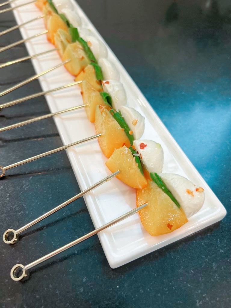 We put our spin on a caprese using ripe summer peaches! The juicy peach combined with the creamy mozzarella and sweet basil makes the perfect one-bite appetizer.